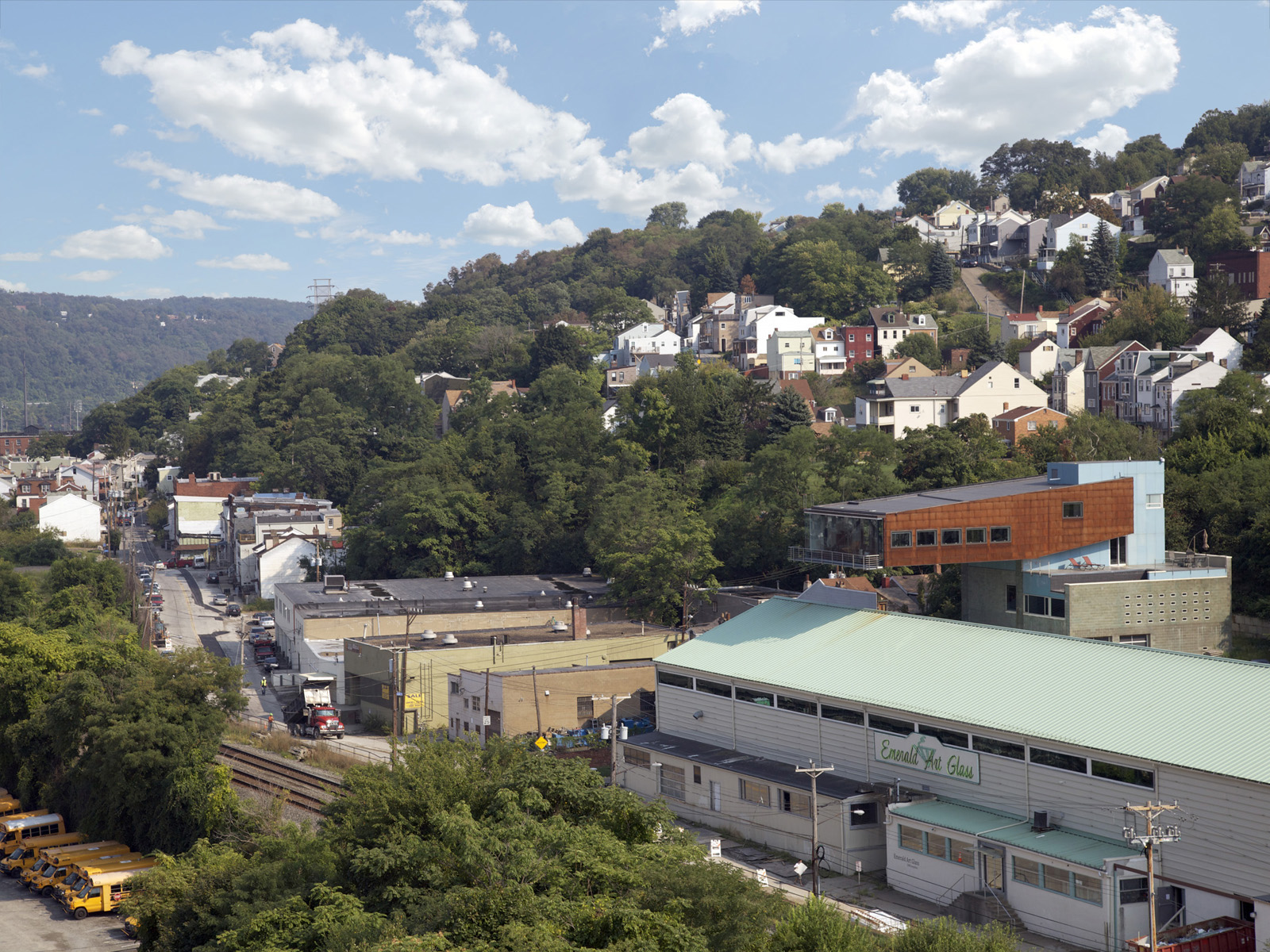 The Emerald Art Glass House is a site-sensitive, cantilevered home for the owners of a glass company. Located on Pittsburgh’s South Side slopes ERIC ROTH